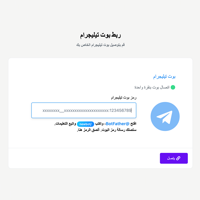Telegram → Connect Bot → لصق رمز البوت → Connect إذا كان الرمز صالحًا، سيتم الربط فورًا.